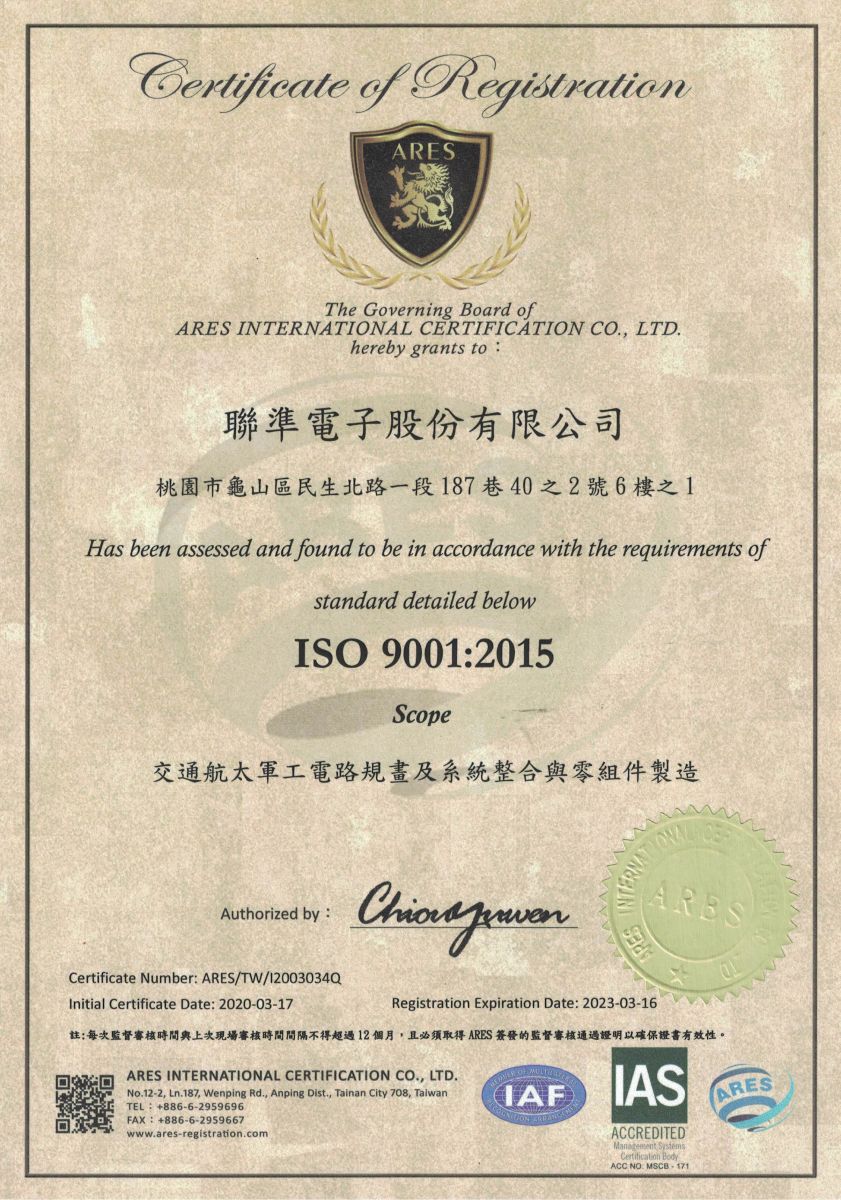 • 2020年 取得 ISO 9001:2015 交通航太軍工電路規畫及系統整合與零組件製造 認證。